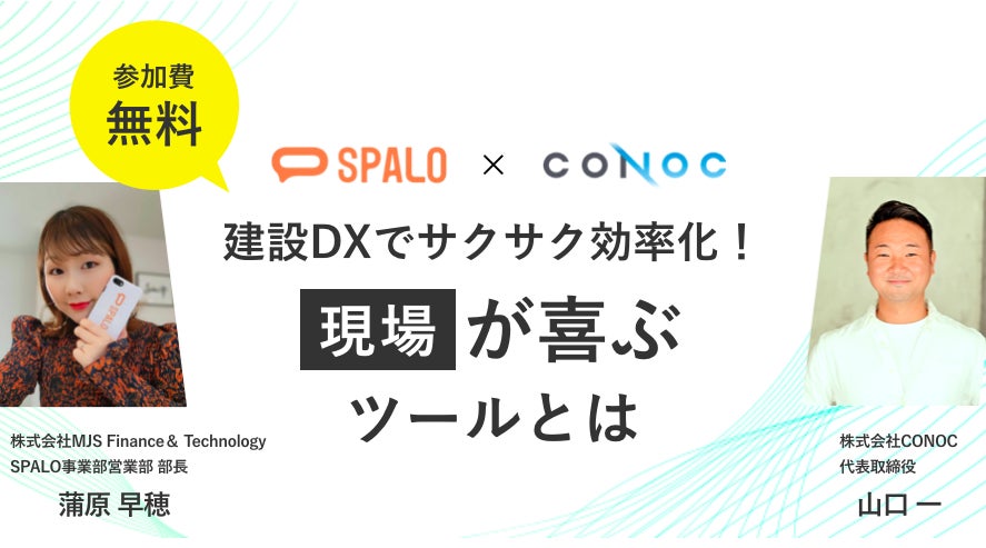 株式会社CONOC(本社:東京都渋谷区、代表取締役:山口一、以下CONOC)は、株式会社MJS Finance & Technology(本社:東京都中央区、代表取締役社長:寺沢 慶志、以下MJS Finance & Technology)と共催で、2022年6月22日(水)に無料オンラインセミナー「建設DXでサクサク効率化!現場が喜ぶツールとは」を開催いたします。