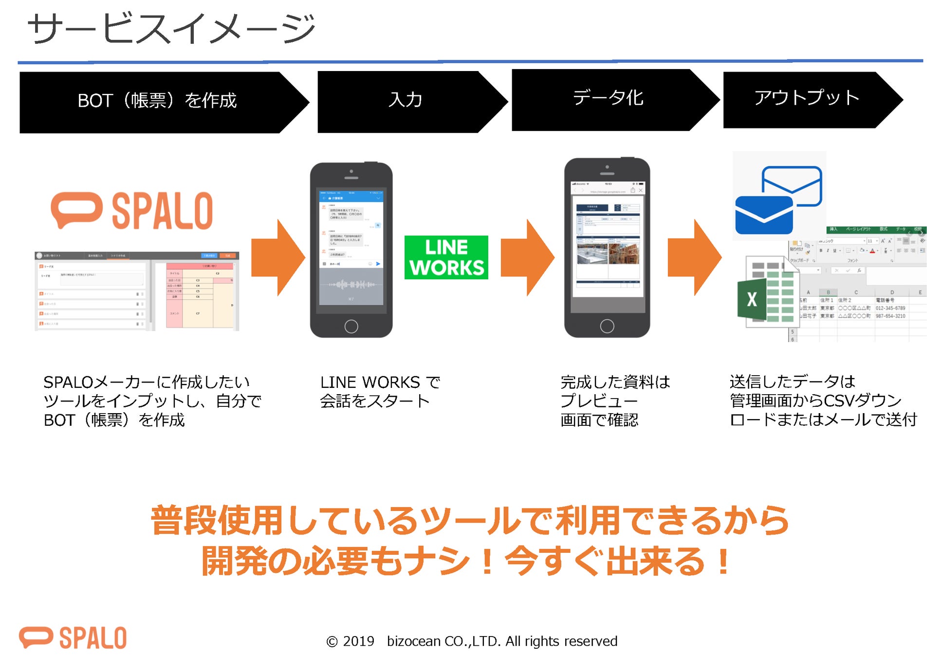 『SPALO』(スパロ)とは、LINE WORKSにも対応したチャットボットによるExcelドキュメント作成アプリケーションです。