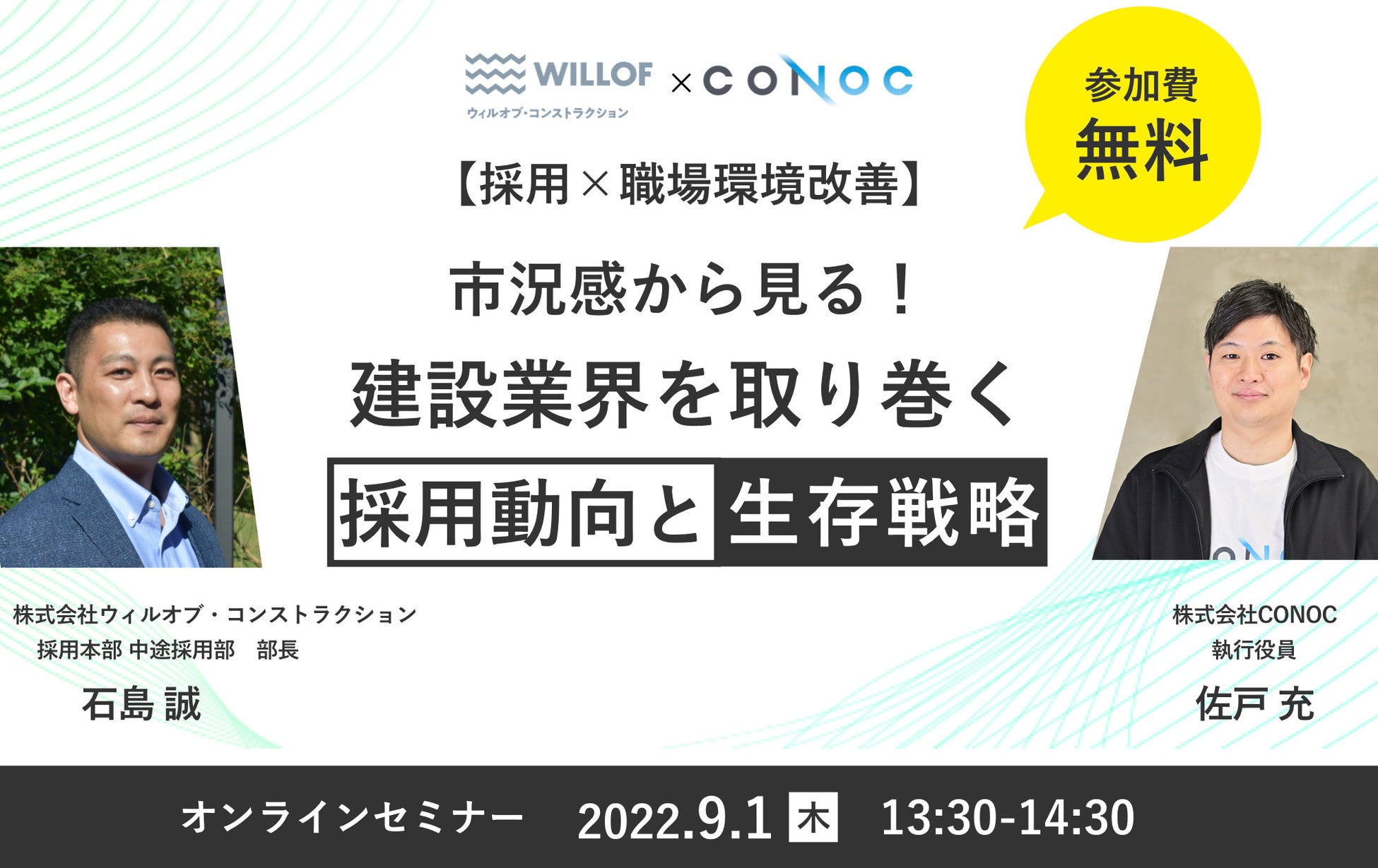 株式会社CONOC(本社:東京都渋谷区、代表取締役:山口一、以下CONOC)は、株式会社ウィルオブ・コンストラクション(本社:東京都新宿区、代表取締役社長:角 裕一、以下ウィルオブ・コンストラクション)と共催で、2022年9月1日(木)に無料オンラインセミナー「採用 × 職場環境改善、市況感から見る!建設業界を取り巻く採用動向と生存戦略」を開催いたします。
